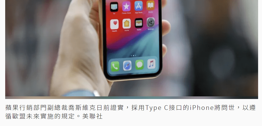 外媒報導蘋果iPhone15就是USB Type-C接頭的iPhone,並會推出轉接Lightning接孔的配件,可讓未來的新iPhone可以相容現有的Lightning接孔周邊產品。