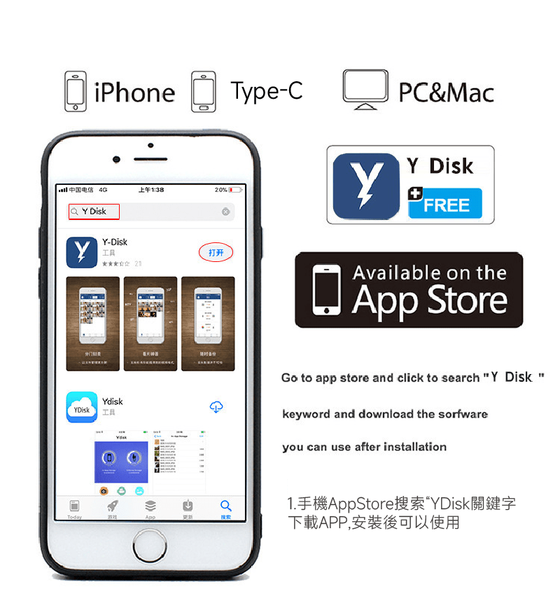 Step1.下載並安裝APP: 在App Store中搜索並下載專用的備份應用程式Y Disk。